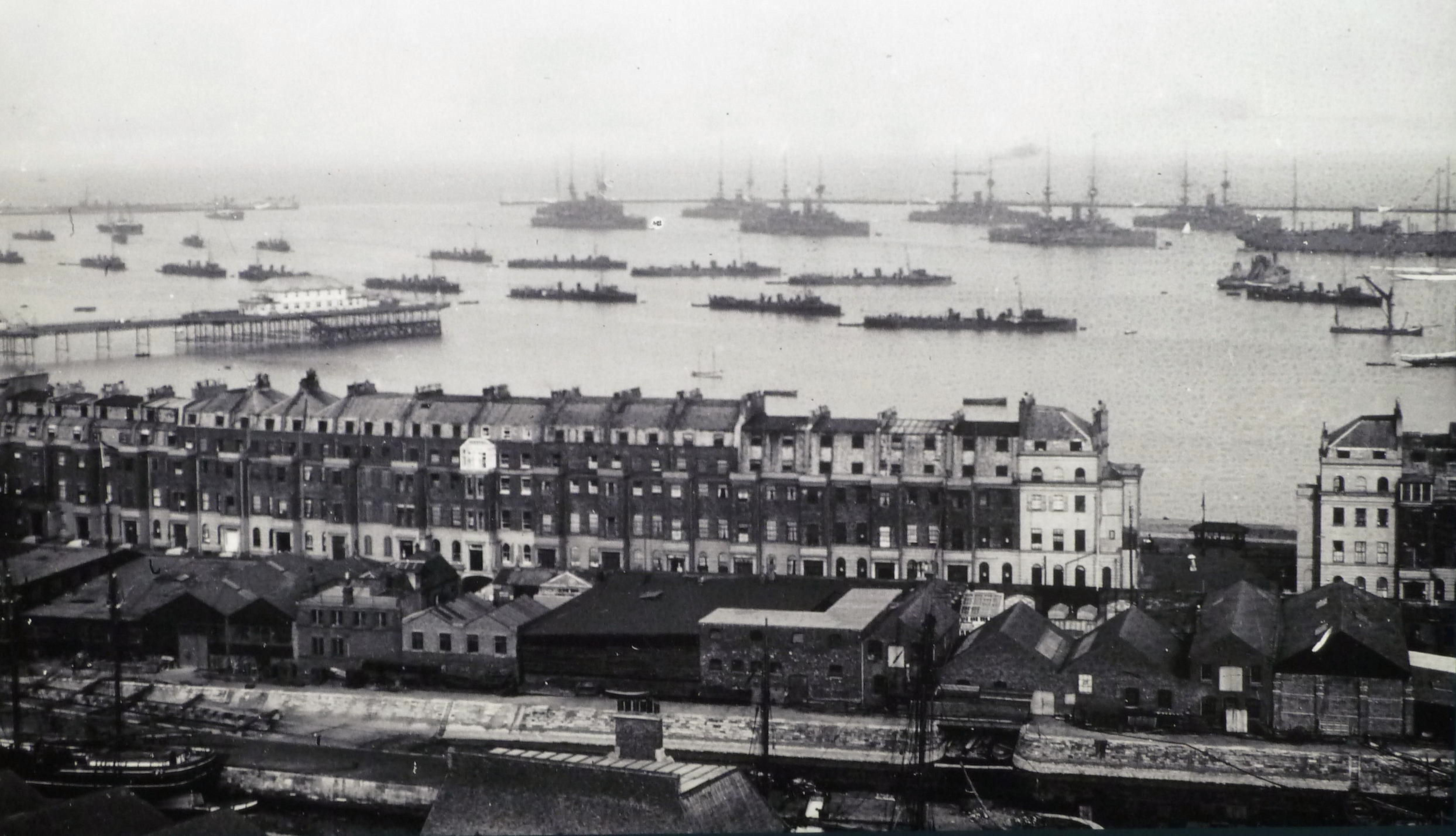 Possibly because the Prince of Wales Pier was a hive of activity, it was popular for promenading. Possibly many of these spectators gave little thought to the full implication of the reasons as to why there was an increasing number of naval ships using the harbour. On 27 August 1911, Kaiser Wilhelm II had made his ‘Place in the Sun’ speech, which inaugurated the expansion of the German navy. From then on, the harbour was frequently visited by naval ships and a large number were present when, on 27 June 1913, Raymond Poincaré (1860-1934) President of France (1913-1920), departed for the Continent.