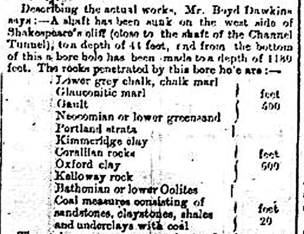Professor Sir William Boyd Dawkins (1837-1929), another eminent geologist, was the main adviser to Watkins’ Submarine Continental Railway Company and he and Brady had discussed the possibility of coal measures in the area. When the Channel Tunnel borings had been ordered to cease, Brady put it to Watkins that they should use the already excavated shafts to undertake test borings for coal. Watkin and the new amalgamated Channel Tunnel Company Board, dismissed the idea as they were concerned with persuading the government to change their mind over the Channel Tunnel. Albeit, Professor Dawkins took up the cudgel and with the help of Brady made a presentation to the Board. He told them that ‘the geological evidence was conclusive that the valuable coalfields of South Wales and Somerset were connected with the equally valuable coalfields in northern France and Belgium, some 1,200 square miles of extent.’