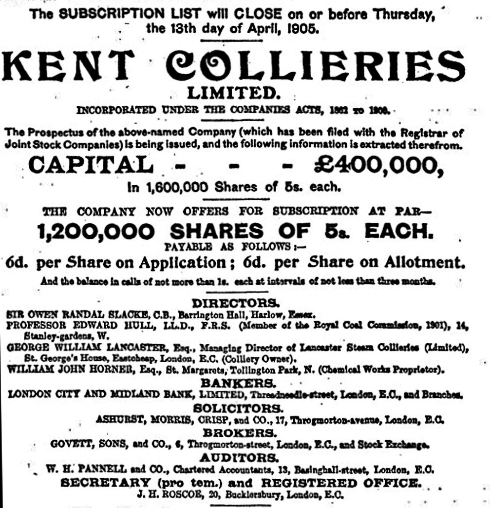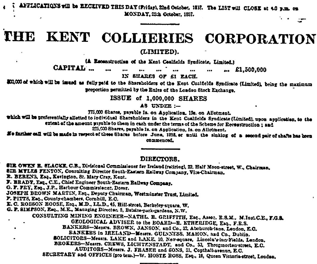 At the beginning of May 1897, Burr had floated a new company, the Kent Coal Exploration Company, offering 225,000 shares at £1 each of which 150,000 ordinary shares were offered for subscription. 25,000 £1 deferred shares were allotted to the promoters and included Cousins in the capacity as Managing Director of the Colliery and General Contract Company. The prospectus talked of reviving the old iron industry of Kent and Sussex making particular reference to a bed of iron ore, 12-feet thick, on the Kent Coal Syndicates property. In July the Kent Coal Finance and Development Company Limited was floated and the five board of directors included Cousins, again in his capacity as Managing Director of the Colliery and General Contract Company. On the Board of this new Company was George Fry, Dover magistrate, member of Dover Harbour Board and Chairman of the Kent Coal Field Syndicate.