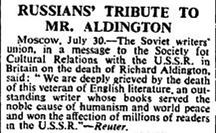 Richard Aldington died at his home at Sury-en-Vaux, France, on 27 July 1962, having recently returned from Russia. On hearing of his death the Russian Society for Cultural Relations wrote, ‘We are deeply grieved by the death of this veteran of English literature, an outstanding writer whose books served the noble cause of humanism and world peace and won the affections of millions of readers in the USSR.’ Some in the British press took a different stance with the Times of 30 July saying that Richard was an ‘Angry Young Man, years before they became fashionable and became an Angry Old Man.’ However, the Telegraph, of the same day, was kinder saying that, ‘Aldington’s brilliance in so many fields of literature has been rivalled by few of his generation and is indeed rare at any time’. To date there is nothing in Dover to mark this celebrated writer.