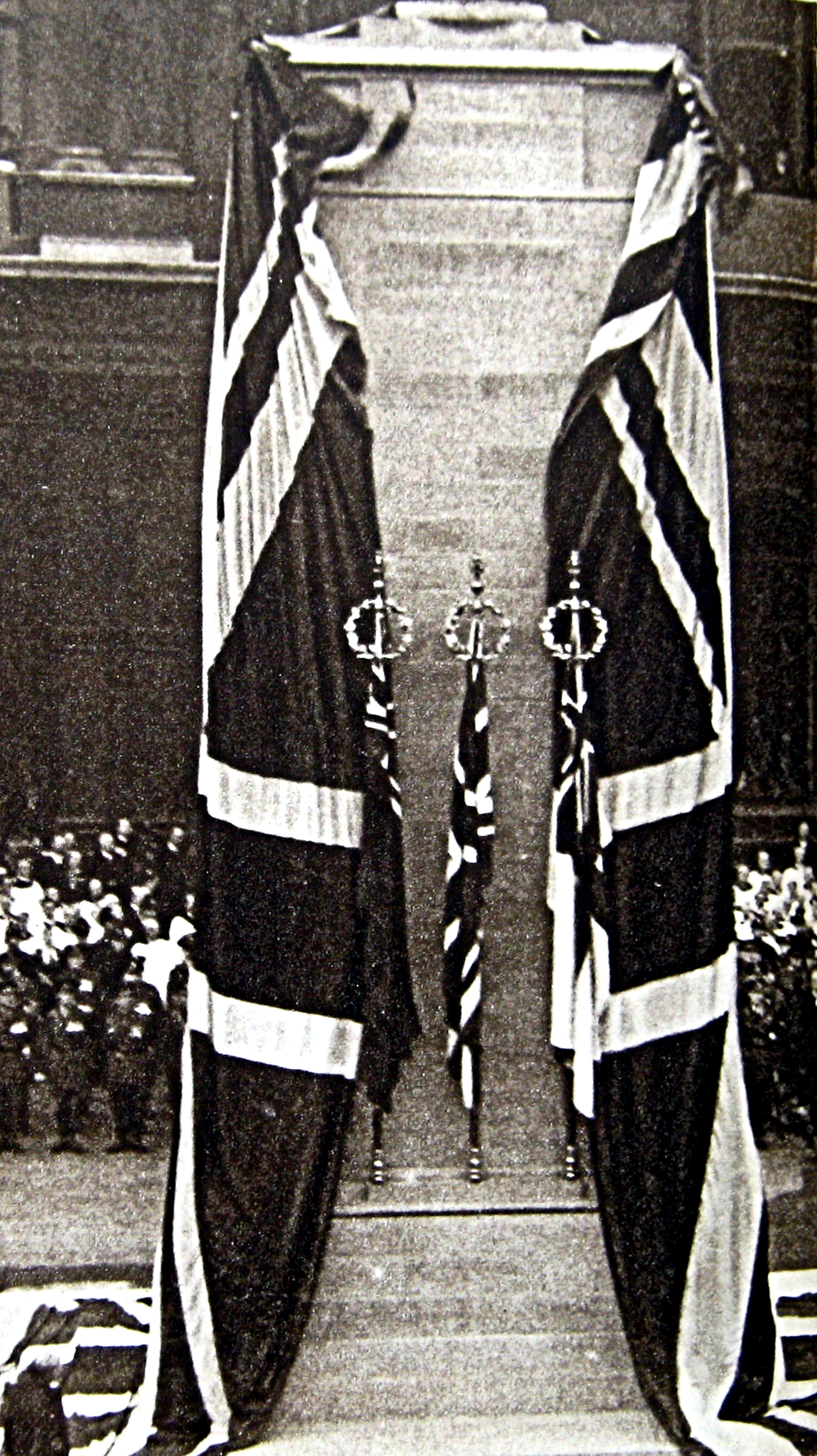 George V and the selected dignitaries were at the Cenotaph and when the coffin arrived the first thing the King did was to place a wreath of laurel leaves and crimson flowers on the top of the coffin. A brief service followed and when Big Ben struck 11.00hours, George V pressed a button and the Cenotaph veiling flags – Union Jacks – dropped to the ground and two minute silence ensued. The stillness was broken by the sound of the Last Post and George V placed a wreath at the base of the Cenotaph. This was followed by the lying of wreaths by dignitaries and appointed representatives of the armed services.