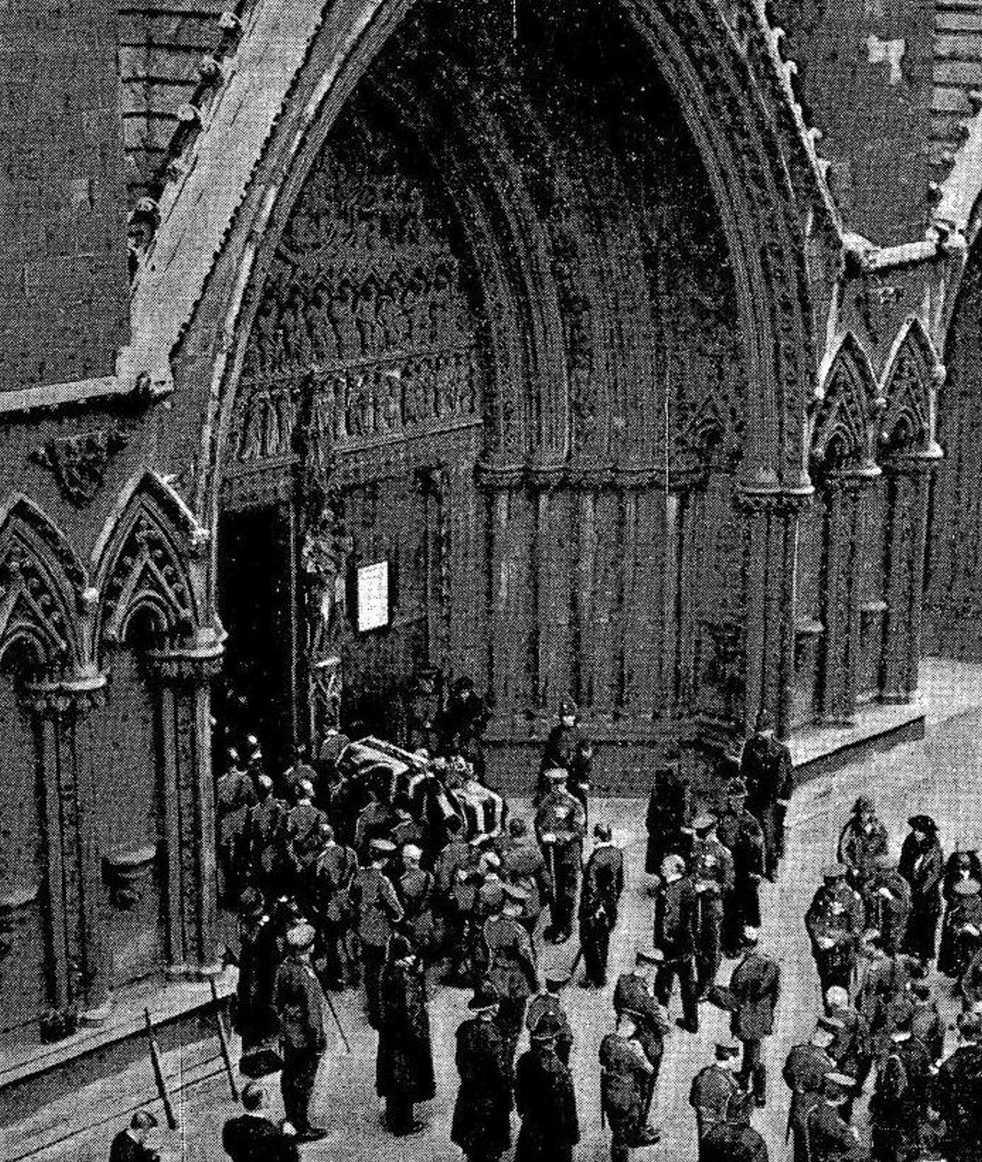 The weather on the morning of 11 November 1920 was bright and clear. The coffin was placed onto a gun carriage and covered with the special Union Jack. On the flag, soldiers placed side arms and a steel helmet. Taking their positions at the side were, Admiral Sir Doveton Sturdoe (1859-1945), Admiral Sir Charles Madden (1862-1935), Field Marshal John French 1st Earl of Ypres (1852-1925), Field Marshal Lord Haig (1861-1928), Field Marshal Sir Henry Wilson (1864-1922), General Lord Horne (1861-1929), General Julian Byng Viscount Vimy (1862-1935), and Air Marshal Sir Hugh Trenchard (1873-1936). The Unknown Soldier left the railway station followed by lines of soldiers doing a slow march to the sound of muffled drums. The entourage took an hour to reach the Cenotaph and along the way the London streets were crowded with silent, motionless, folk – many with their heads bowed.