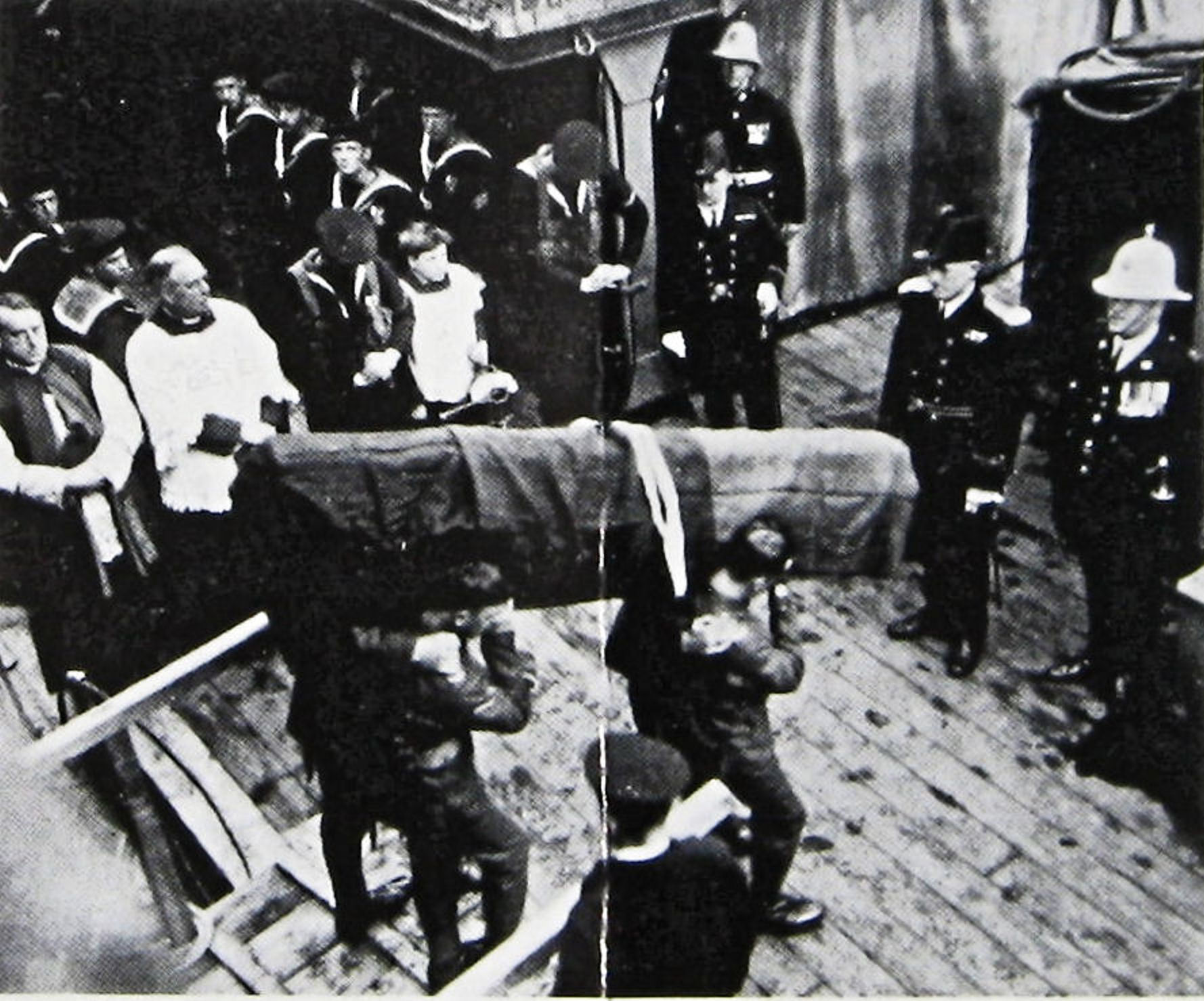 The Verdun, with an escort of destroyers, arrived outside Dover’s Western entrance at 13.00hours. The sky, it was reported, was solid grey – appropriate to the occasion. The colour was reflected in the calm sea and the normally white cliffs of Dover took on a grey hue as did the town and Castle. Although Dover’s seafront was crowded, all was quiet when at 15.00hours the Verdun, followed by her escort, slowly steamed along the entire length of the Southern breakwater to the Eastern entrance. From there she came in alone, the escort of destroyers having returned to sea. The Verdun made her way across the harbour and at the same time the Field-Marshal’s salute of 19 guns was made from the Castle. The silence returned and the lines of troops waiting along the entire length of the Admiralty Pier stood, their heads bowed and arms reversed.