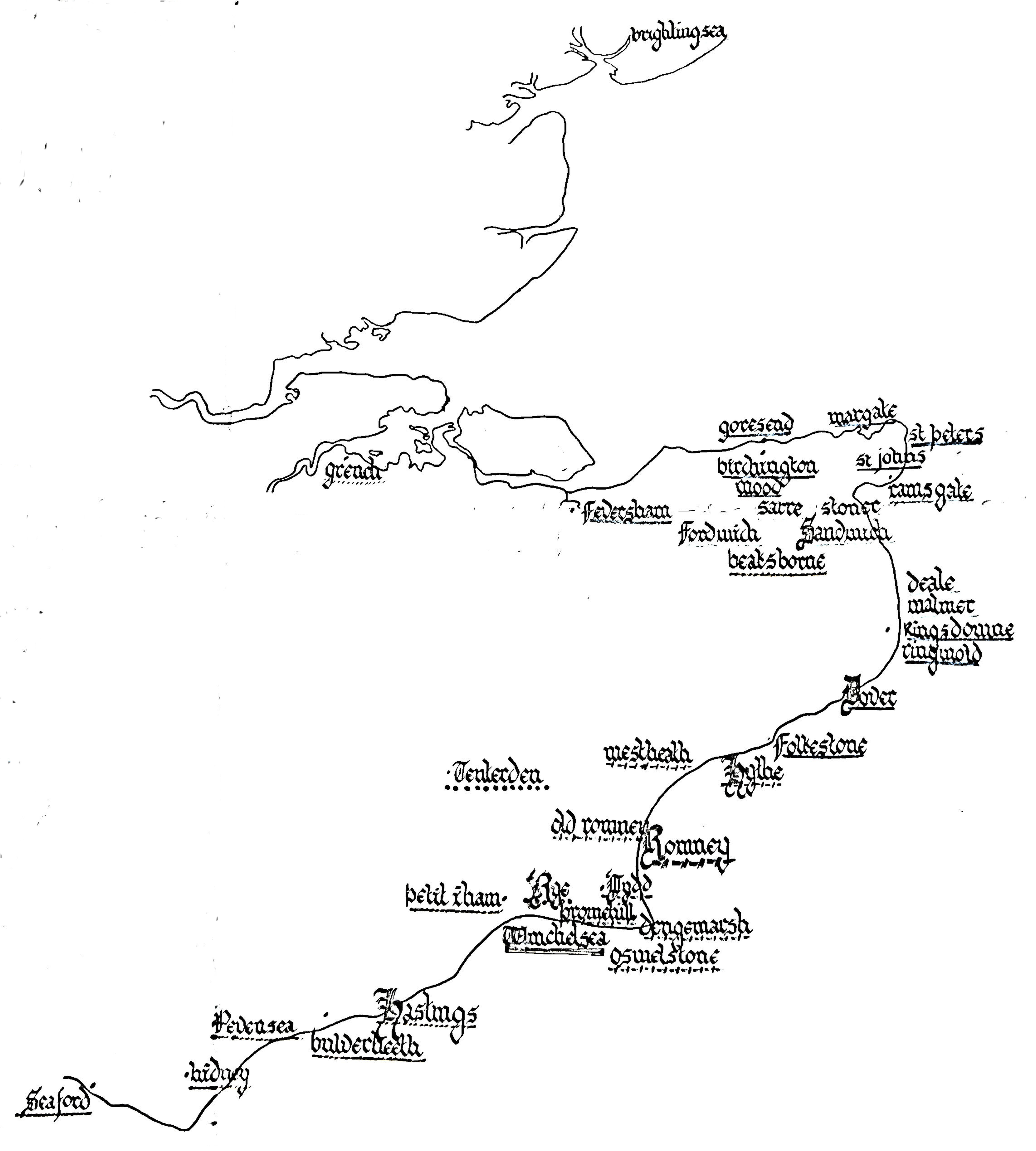 Not long after, East Kent came under attack from the Danes who were repulsed by the Portsmen and their allies from the ports of Hythe and Romney. This provided proof of loyalty to William and he drew up a new Charter. In this the stronger port of Hythe substituted that of Lymne while Romney, west of Hythe, was added, as the coast there was unprotected. Further, their mariners were well known for being as hardy and ferocious as those from Dover. Finally, Hastings was included, to the west of Dungeness point, in honour of his victory there. William also made Hastings the head Port and collectively, thereafter, these five Ports were called the Cinque Ports – pronounced ‘sink’. The Freemen of all these ports who provided ship service were called Barons and the Charter stated that the Cinque Ports Barons, and their heirs ‘do to us and to our heirs Kings of England yearly their full service of fifty-seven ships at their cost for fifteen days at the summons of us or our heirs.’