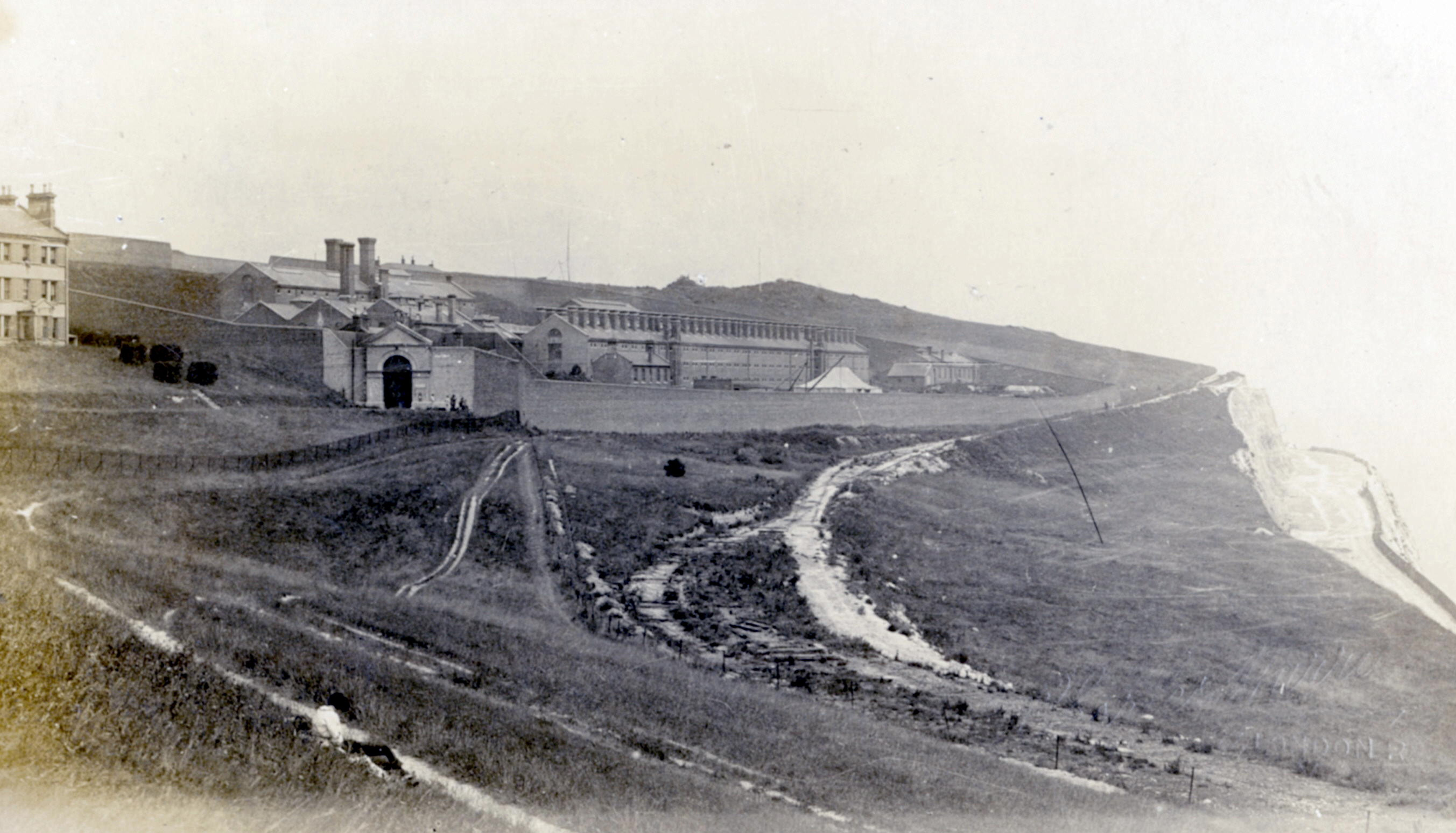 When work on the Admiralty Harbour was started the Northfall Tunnel was closed and a pathway was excavated with the prospect of it eventually becoming a broad road connecting Dover to the South Foreland. A subterranean tunnel, from the precincts of the old prison to the beach below, was hewn within the cliffs and parallel water pipes were laid. The water was piped from the prison reservoirs to the Eastern Arm building site. Besides the reservoirs on maps of that time is the statement, ‘Soft water for use by the Admiralty.’ This has been interpreted to mean that the water was to be used for ship’s boilers, as hard water was not suitable. The Martin Mill – Dover light railway line was cut across the cliffs to carry shingle for the construction of concrete blocks at what became the Eastern Dockyard and passed close to the prison site. On reaching the cliff edge, the wagons were emptied into side tipping skips that were taken down the cliff face on a funicular.