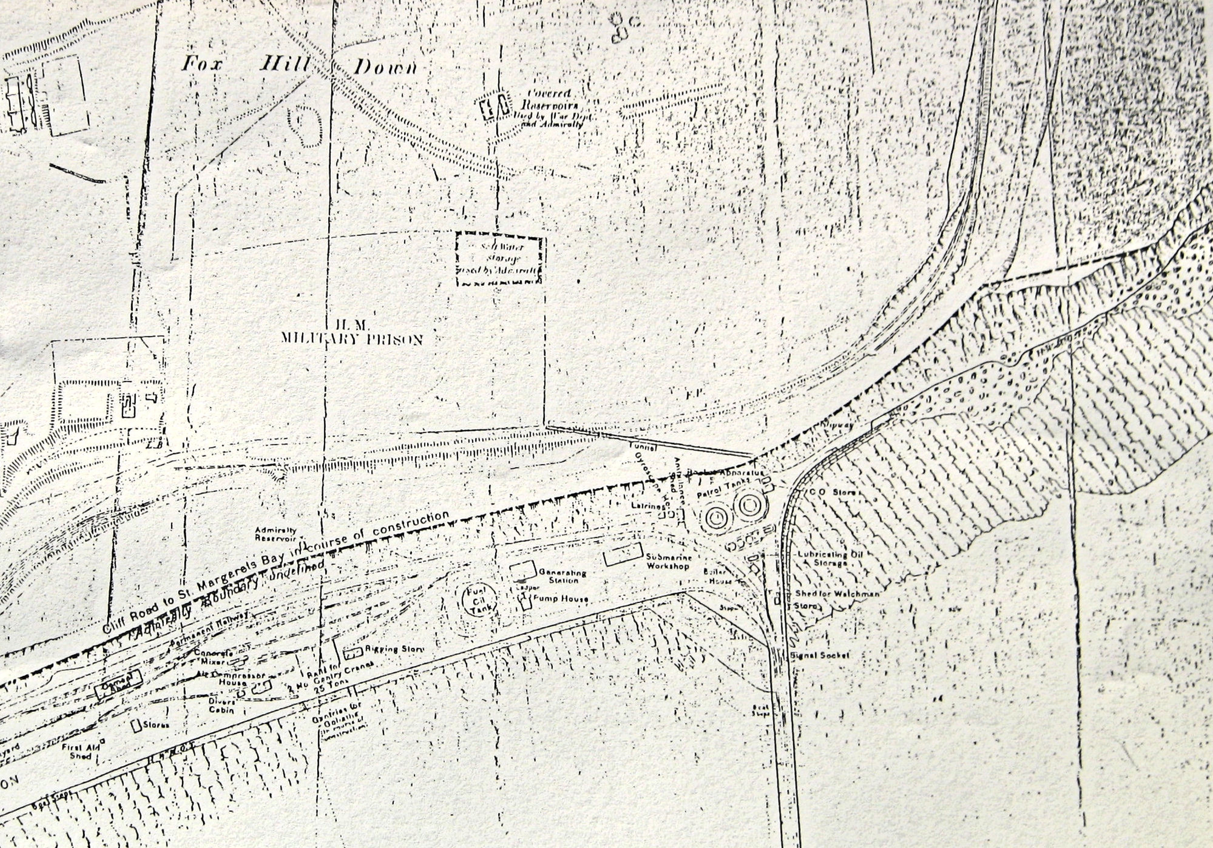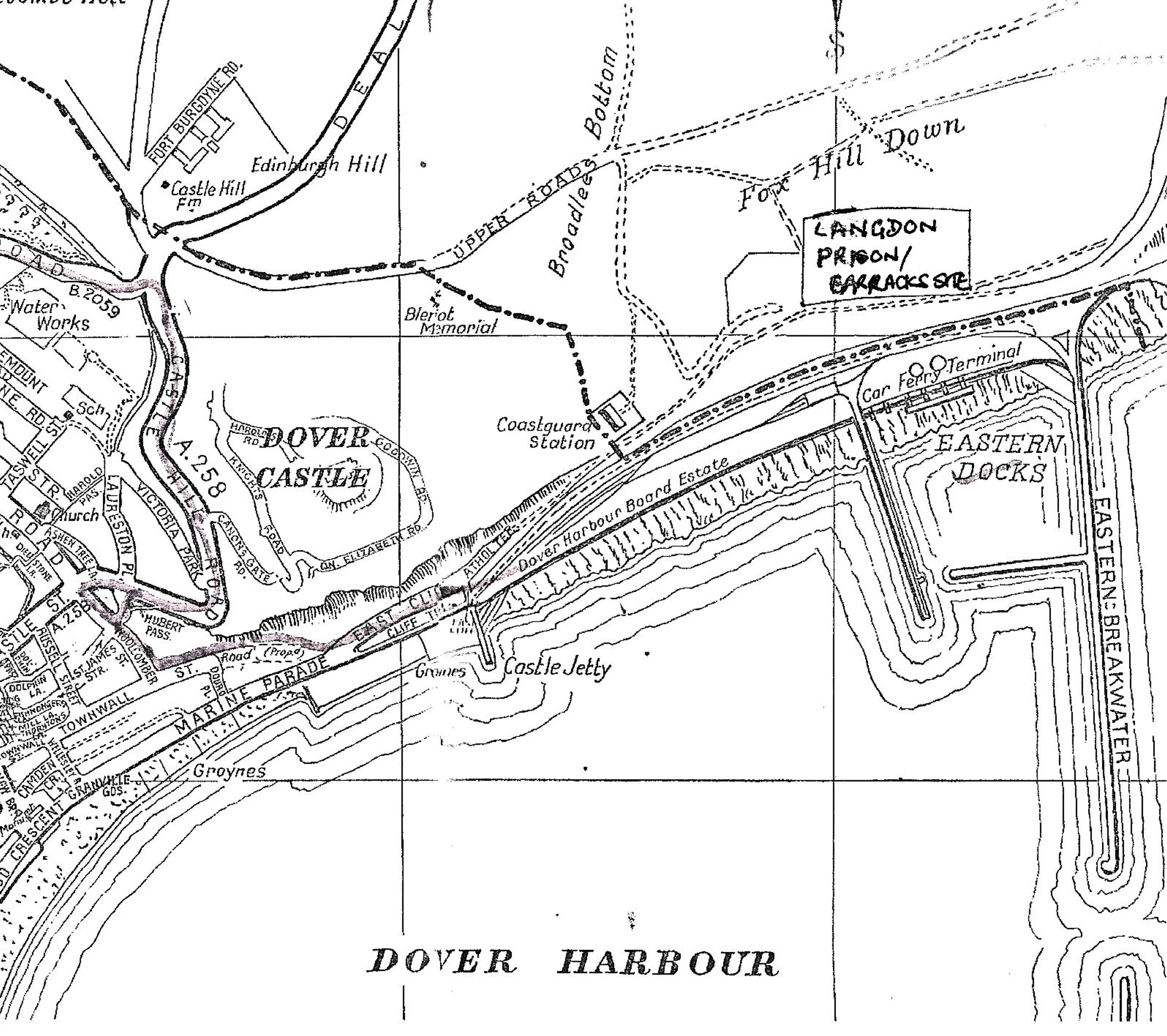Langdon Convict Prison / Broadlees Military Prison Langdon Cliff Map c 1903 showing location. Note reservoir caption & the proposed road to St Margarets. Dover Library