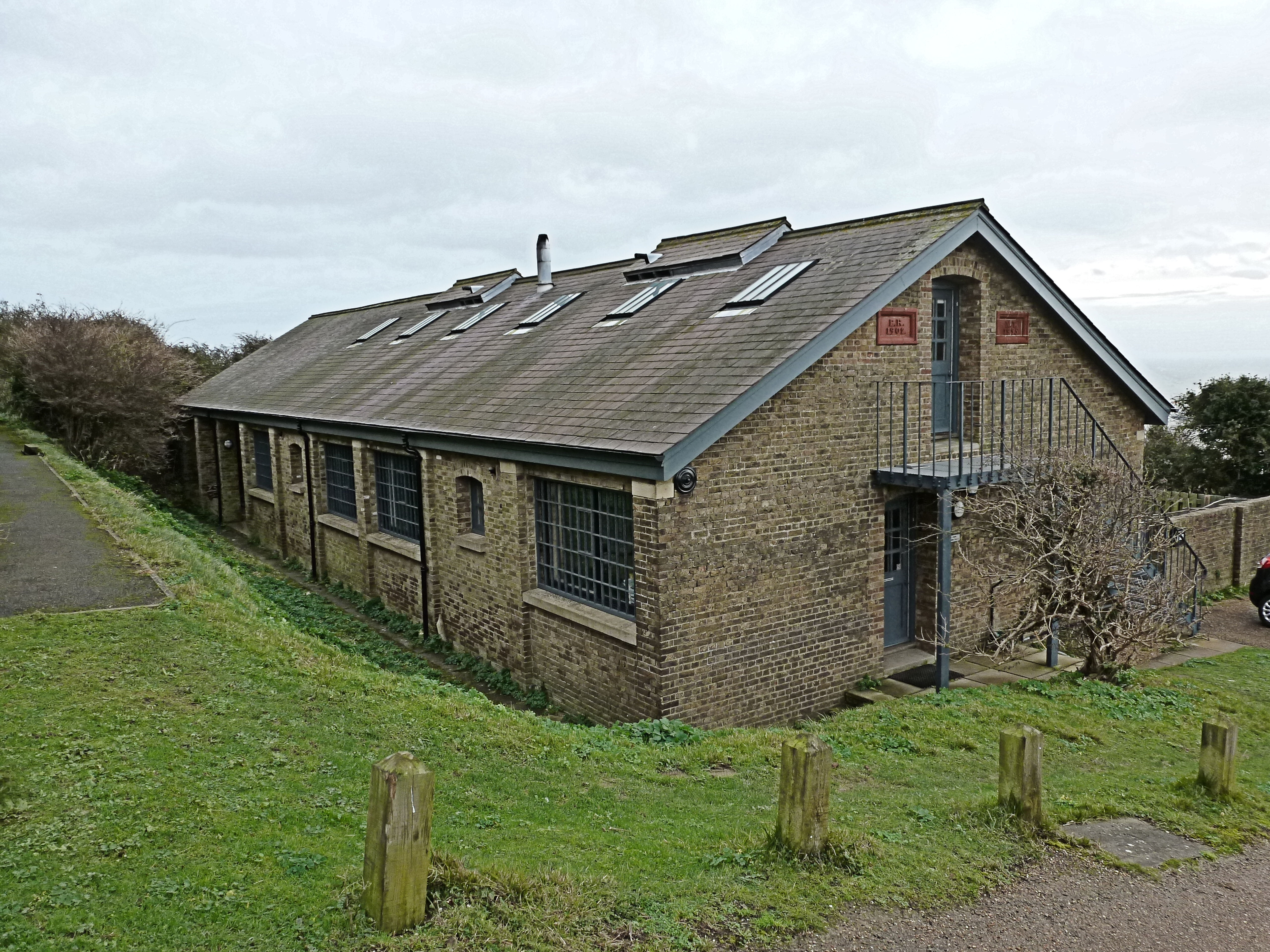 One of the two former Prison buildings at Langdon Cliff that are still standing. The plaques give date of construction as 1902 and refurbishment in 1995. A Sencicle