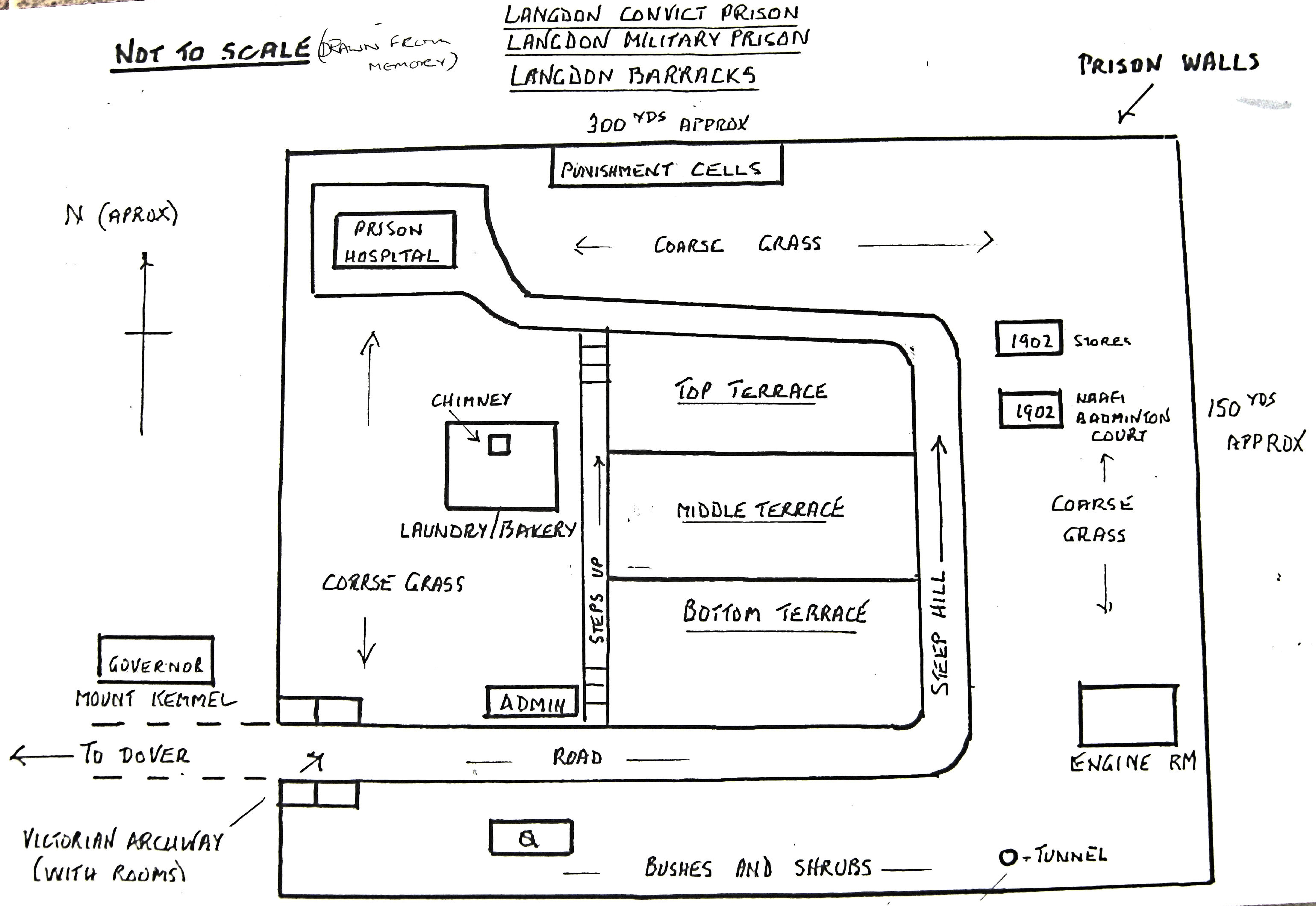 Nonetheless, the land for the prison was bought and the contract for building it was advertised. Several firms, including three from Dover, put in tenders and the contract was won by Denne of Walmer. He had projected to do the job for £25,000, the lowest tender and that it would be finished within a year. Within hours of winning the contract Mr Denne was looking at the site, which was about half a mile from the Castle where the ground gradually sloped down to the edge of the cliff. When Mr Denne arrived, Major Hardiman met him and already there was a pile of several thousand bricks waiting on the three acre building site. The governor’s residence, Mr Denne was told, was to be to the west of the Prison and to the east, warders’ houses. There would be a prison hospital, a separate laundry, administration block, bakery and engine room. The actual prison was to be three storeys high and the complex surrounded by a 15-foot high solid boundary wall that would be about three-quarters of mile in extent.