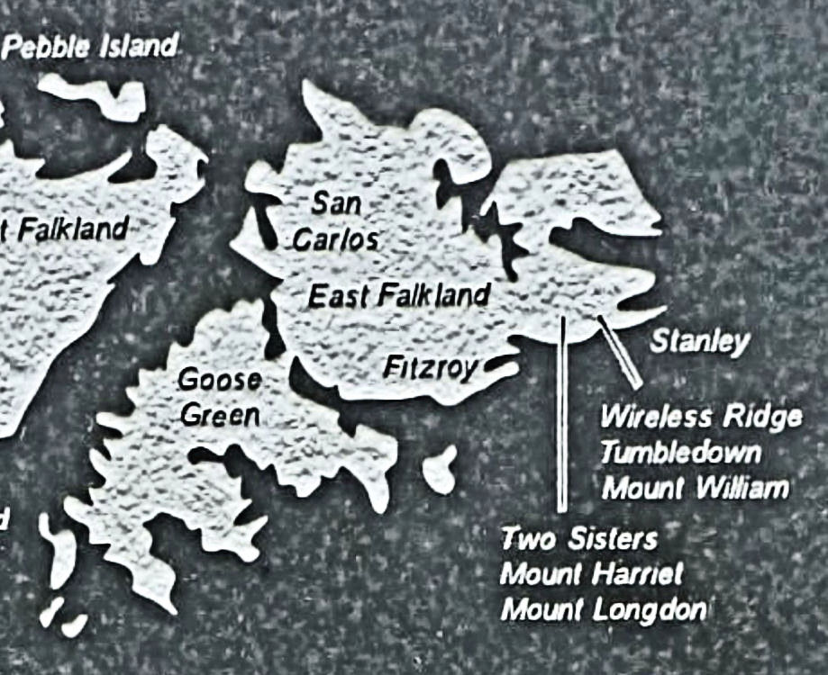 On 10 June final preparations were made to capture Two Sisters, Mount Harriet and Mount Longdon, the high ground surrounding Stanley. As strategic positions they were well defended with Mine Fields and gun emplacements. Men from 45 Commando, 40 Commando and 29 Commando under Lieutenant-Colonel Andrew Whitehead and with naval gunfire support from Glamorgan, at 02.00hours started their assault on Two Sisters. It took all of that day against fierce resistance from the Argentinians to take the twin peaks. Lieutenant Colonel Nick Vaux, the commander, led 42 Commando into the Battle for Mount Harriet on the night of 11/12 June with support from 29 Commando and naval gunfire support from the frigate Yarmouth. Again the Argentinians put up fierce resistance as they were also doing at Mount Longdon, which 3 PARA were attempting to take. Mount Longdon was/is long and narrow with two peaks covered in rocks. To the east lay Wireless Ridge that continued eastwards to Moody Brook and to Mount Tumbledown. The estimated strength of the Argentinian forces holding Mount Longdon was 800 men supported by heavy artillery sited at Moody Brook.