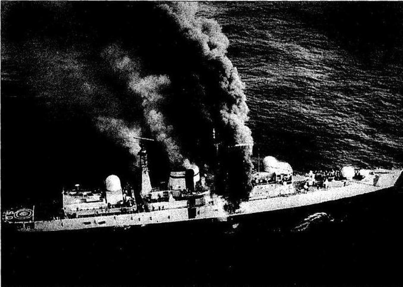 Two days after the sinking of the Belgrano, on 4 May, an Argentinian Exocet missile hit the British destroyer Sheffield launched by Queen Elizabeth II in 1972. It was fired at 11.04hours approximately 20-30 miles away from a Super Étendard fighter, piloted by Lieutenant Armando Mayora and Lieutenant Commander Augusto Bedacarratz, who was commanding the mission. The aircraft came from the Rio Grand air base, Tierra del Fuego, flying below the Task Force’s radar screens. Captain James William Salt (1940-2009) only had time to shout ‘Take cover!’ Before the missile struck Sheffield amidships about 8-feet above the waterline. The result was an inferno killing 20 and severely injuring 24 of the crew. Fire crews from other ships fought the raging fire but as she was being towed to South Georgia Sheffield sank. The site is now a designated War Grave. Sheffield was the first loss of a major British warship in 37 years.