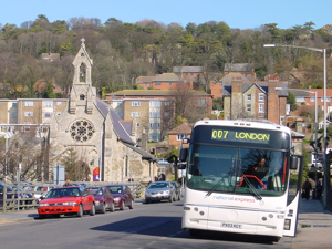 Pencester Road looking east with the 007 London National Express 007 coach service. Left St-Paul’s Roman Catholic Church, Maison Dieu Road. Alan Sencicle