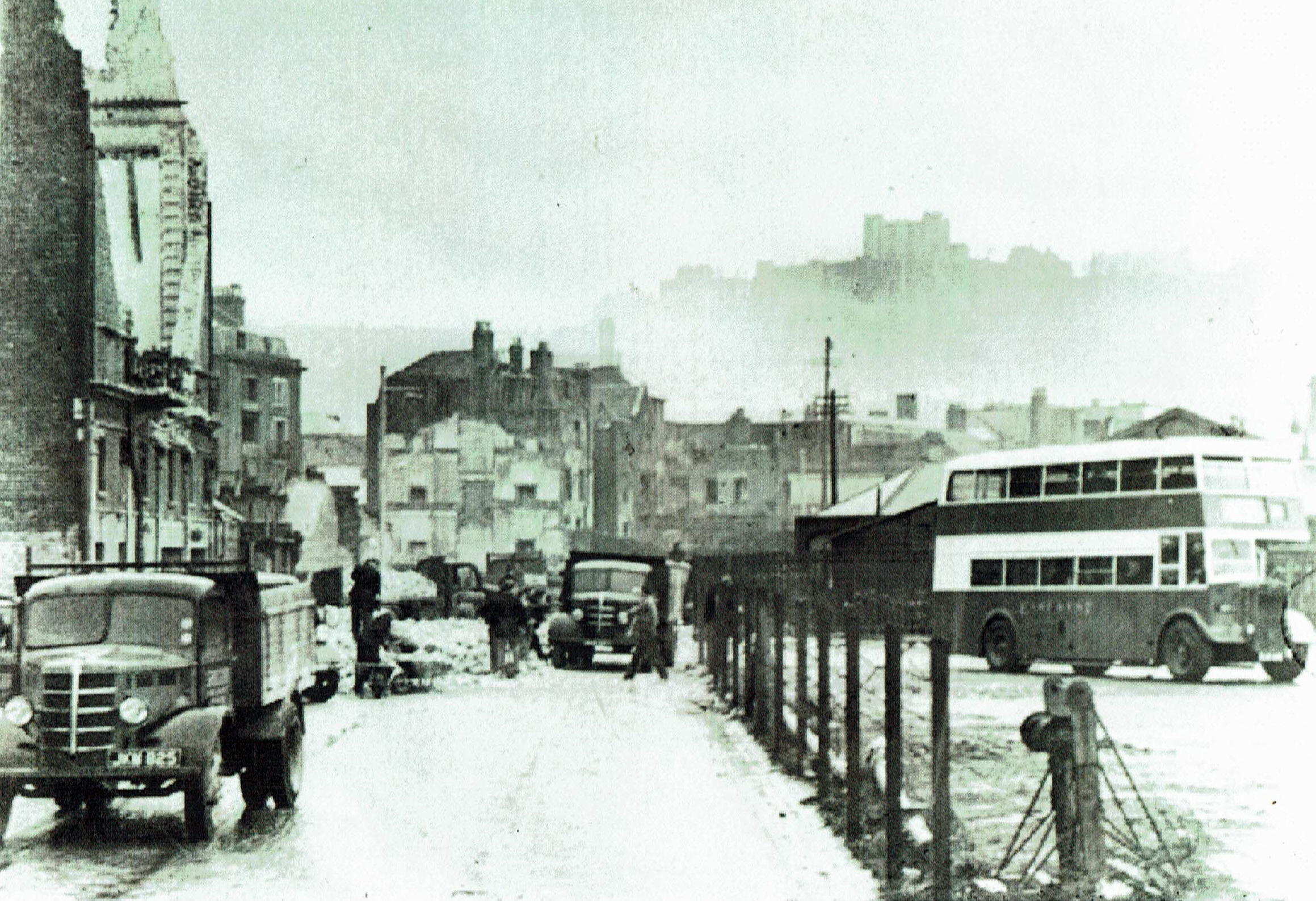 As his bus from Canterbury arrived in Dover, the journalist saw evidence of the continual shelling and bombing everywhere yet the attitude of Dover people had hardly changed. The only major difference was the children were not so much in evidence on the bombsites as a semblance of schooling had been introduced in the intervening period. On arrival in Market Square, he noted the bombed-out EKRCC office and the other wrecked buildings and made his way to Dover’s Russell Street bus garage and stood aghast looking at the devastation. The derelict building was empty except for a bus being refuelled by the driver who told him that ‘luckily the tanks had remained intact and that they were still being used for company buses.’