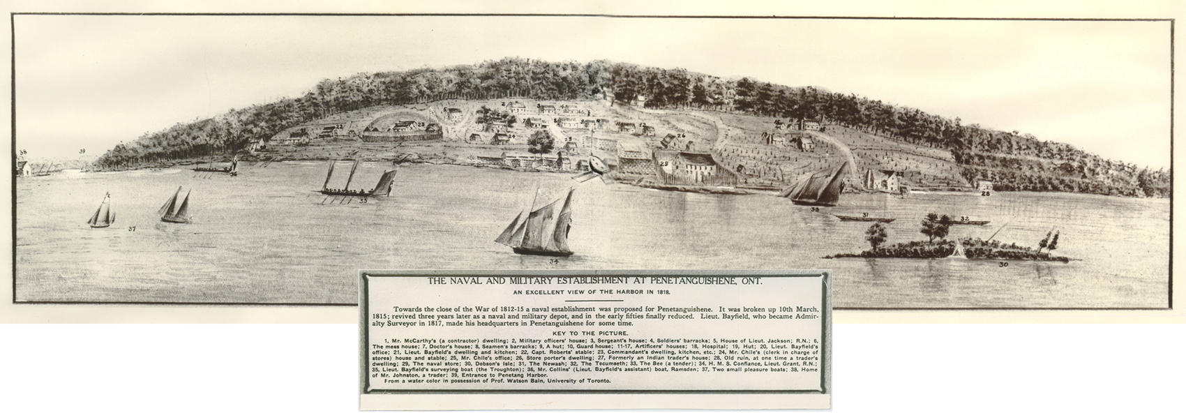 The abdication of Napoleon in April 1814 released British troops and an invasive strategy was pursued. In August 1813, four companies of Canadian Fencibles under Cockburn were sent to Prescott and on 7 0ctober the crossed the St. Lawrence River at Red Mills and successfully surprised a party from the 1st Regiment of U.S. Dragoons. Before Cockburn arrived in Canada, British army General, John Graves Simcoe (1752-1806), became the first Lieutenant-Governor of Upper Canada (1791-1796) and had founded York Town. At Georgian Bay, a large bay of Lake Huron and along its shores, Simcoe had recognised that Penetanguishene, on the west coast, would be ideal for a harbour.