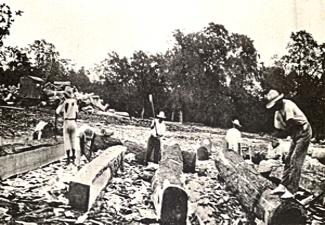 Squaring mahogany logs for export in Belize. Around 1936 from ‘The forests and flora of British Honduras’ by Paul Carpenter, 1884-1963. Wikimedia.org