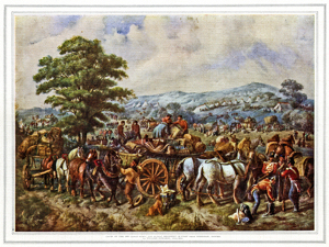 When Napoleon abdicated he was exiled to the island of Elba, west of Rome, in the Mediterranean. In February 1815, he escaped, quickly amassed an army and the Napoleonic Wars resumed. During the morning of 18 June that year, Napoleon and Wellington faced each other at Waterloo, Belgium. The battle was one of the bloodiest in history and lasted nine hours. 200,000 infantry, cavalry and gunners took part of which more than 13,000 were killed and 35,000 wounded. Afterwards approximately a quarter of a million soldiers and sailors, many of them maimed, returned to Britain and were faced with unemployment and destitution. Crops had been poor and in an effort to curtail imports to protect the price of home produced good, the Corn Laws had been introduced. These only served to make some very wealthy but the general population, much worse off. Income Tax had been abolished, replaced by taxes on staple commodities such as candles, paper and soap as well as luxury goods. In addition the Poor Law relief rates had been drastically cut, which meant that starvation was rife. Many of the soldiers who were in the colonies at that time, such as Canada and the Caribbean, were encouraged to stay where they were and offered land grants.