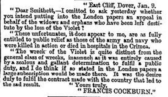 Lieutenant General Sir Francis Cockburn’s letter to the press over the Violet disaster. Times 14 January 1857