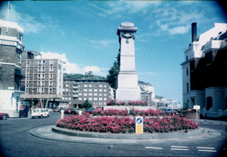 Rifles Monument in 1975 showing the west side (Rohilcund). Note the iconic Dover Stage Coachotel on the left standing on stilts. Dover Museum