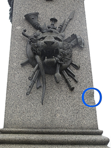 Below the cornice at the top are bronze swags on which are hung medals of previous battle honours and the North face additionally has a bronze trophy with a lion’s head mask.