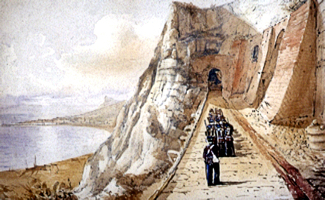 Just before the outbreak of the Napoleonic Wars (1793-1815), the Guilford Shaft was excavated to link Mote Bulwark with the Castle on the cliffs above. In 1813, Reverend John Lyon (c1838-1817), vicar of St Mary’s Church wrote, ‘near the edge of the cliff, and not far from the end of the wall, a shaft has been sunk, one hundred and ninety feet deep, to form a communication with Mote’s Bulwark … In this shaft there are circular stairs, and when the Prince of Wales* visited the Castle in 1798 he was conducted down it, as the nearest way to the town.’ *The Prince of Wales was later George IV (1820-1830).
