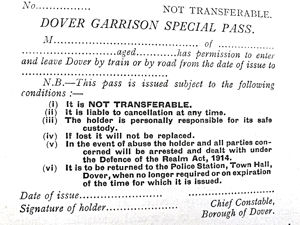 Entrance and exit to Dover could only take place by the railways and the main roads to Folkestone (old A20), Deal (A258) and Canterbury (old A2). Special ‘Dover Garrison’ passes, limited in number, were necessary for all those who required to enter or leave the town, whether they were military, naval or the general public, and were issued by Dover’s Chief Police Constable David Fox (1864-1924). The Military Authorities had the power to arrest and search. All local newspapers were subject to censorship by the military and anyone approaching any defensive works was to be stopped, questioned and searched. The South East and Chatham Railways triple screw turbine packets, Empress II launched in 1907, Engadine and the Riviera both launched in 1911, were commandeered by the Government and fitted out to carry sea planes.