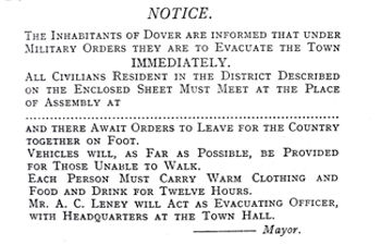 Although the initially named submarine base was in the Camber, at the Eastern Dockyard, on completion the Sixth Destroyer Fleet was based there. The general feeling by government was that the problems on the Continent were to be short lived. Peace was expected by Christmas and the seaplanes, aeroplanes and the destroyers would be transferred elsewhere. From then on, just the pre-War military bases would be stationed permanently at Dover. The military were not so optimistic and Brigadier-General Crampton issued a warning notice, through Mayor Farley’s office, to nearly every household in Dover. This notice stated that if the Military order for them to evacuate the town they were to do so IMMEDIATELY.