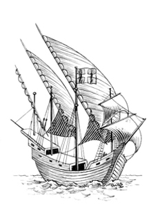 15th century Carrack ship. Note the lateen sail at aft end. In 16th century more sails were added. Frank E Dodman