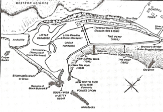 Further, the Eastward Drift – a phenomenon caused by the tide sweeping round Shakespeare Cliff and depositing masses of pebbles at the eastern end of the bay, was causing significant financial problems, as the pebbles had to be constantly removed from the entrance to Eastbrook Harbour. Then when the town thought that matters could get no worse, there was a major cliff fall from the Eastern Heights, blocking the harbour and rendering the Eastbrook harbour useless and causing serious flooding. Consideration was given to abandoning the town, as there were only a few inhabitants and the religious houses remaining. The remaining mariners moved their ships to a sheltered area at the western end of the bay where Archcliffe jutted out. This gave just enough protection from storms and from there they earned a living fishing.