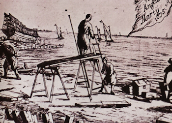 As the shipyards developed, the number of associated trades increased and those with skills gained elsewhere by apprenticeship were awarded with freemanship on payment. A skilled ship’s carpenter’s tools at this time would comprise of a trestle for cutting or splitting planks of oak using double ended saws. The oak planks were refined to meet the shipbuilder’s specifications by using handsaws and tools developed by the individual craftsmen. If the wood was to be shaped, to make it pliable the plank was placed in a long steam box and the water heated to the boiling point – 212degrees Fahrenheit or 100degrees Celsius. Businesses such as blacksmiths, ropemakers, riggers and sailmakers also set up and like the shipbuilders and carpenters, initially they served their apprenticeship, and gained their freedom by hereditary or purchase. Once purchased their freedom became hereditary for their descendants.