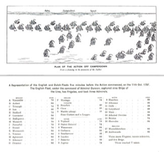 A representation of the English and Dutch fleets five minutes before action commenced in the Battle of Camperdown on 11 October 1797. The English fleet under the command of Admiral Adam Duncan (1731-1804) captured nine ships of the Line, two ships and took three Admirals. The battle is considered one of the most significant in British naval history. R is the Dover built frigate Circe carrying 28guns. Wikimedia