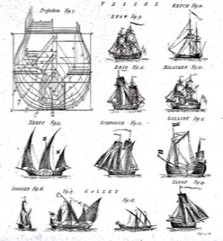 The diagram opposite comes from the Observers Book of Ships by Frank E Dodman (c1950) and shows the masts and sails of a Topsail Schooner. The rope on these ships was mainly used for rigging, a skill that was usually undertaken by sailmakers and ropebenders. Rigging tended to be divided in two types, Standing rigging, which helped to keep the masts in their permanent positions and Running rigging that controlled the movement and position of yards and sails. As can be seen from the diagram, the names of the sails come from the names of the masts to which they were attached.