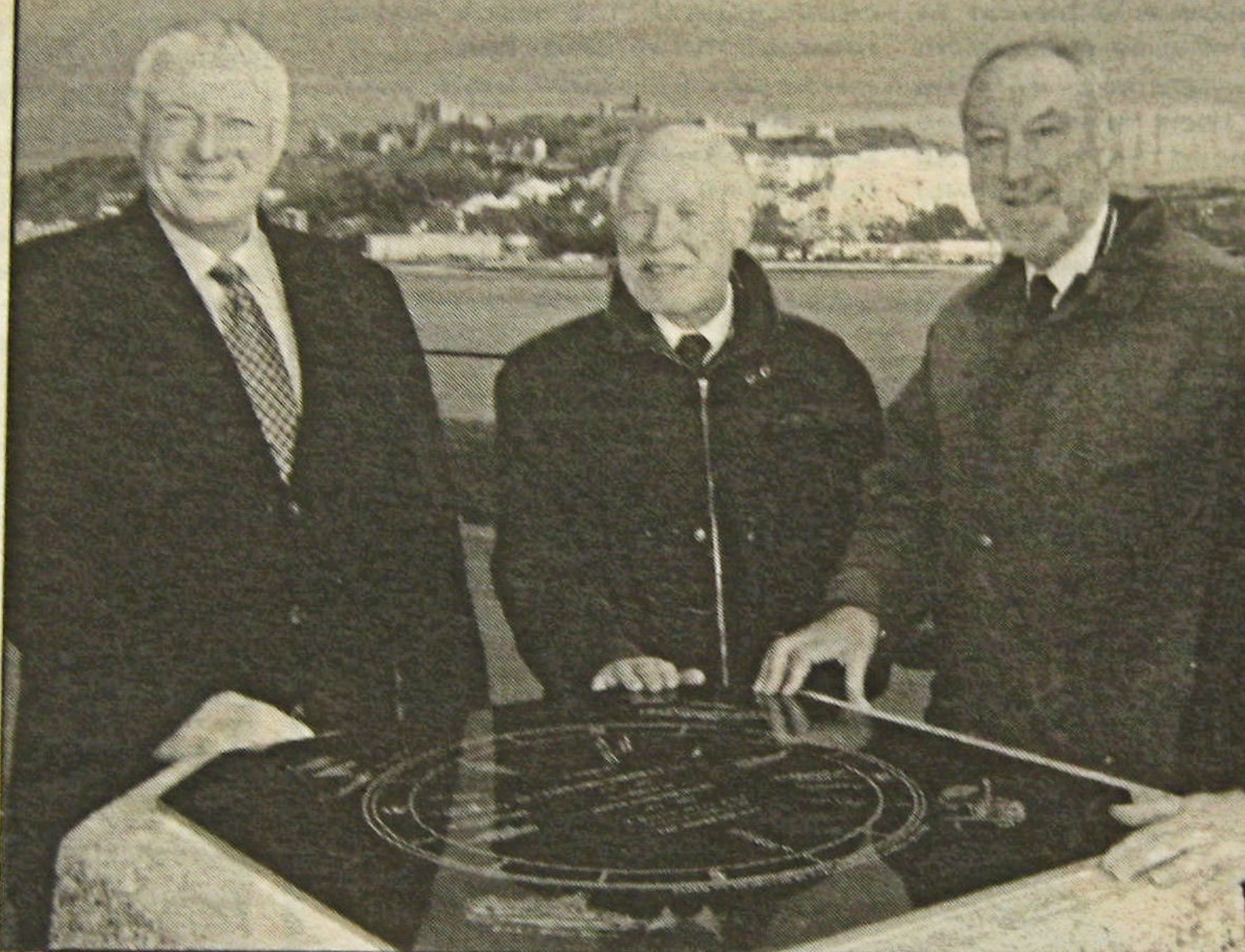 The unveiling of the refurbished Sir Clifford Jarrett (1909-1995) memorial – a former Chairman of DHB – on the Prince of Wales Pier, February 2005. Left to right, Bob Goldfield – the Chief Executive of DHB, middle and right – Dover Society’s Jeremy Cope and Derek Leach. Dover Mercury
