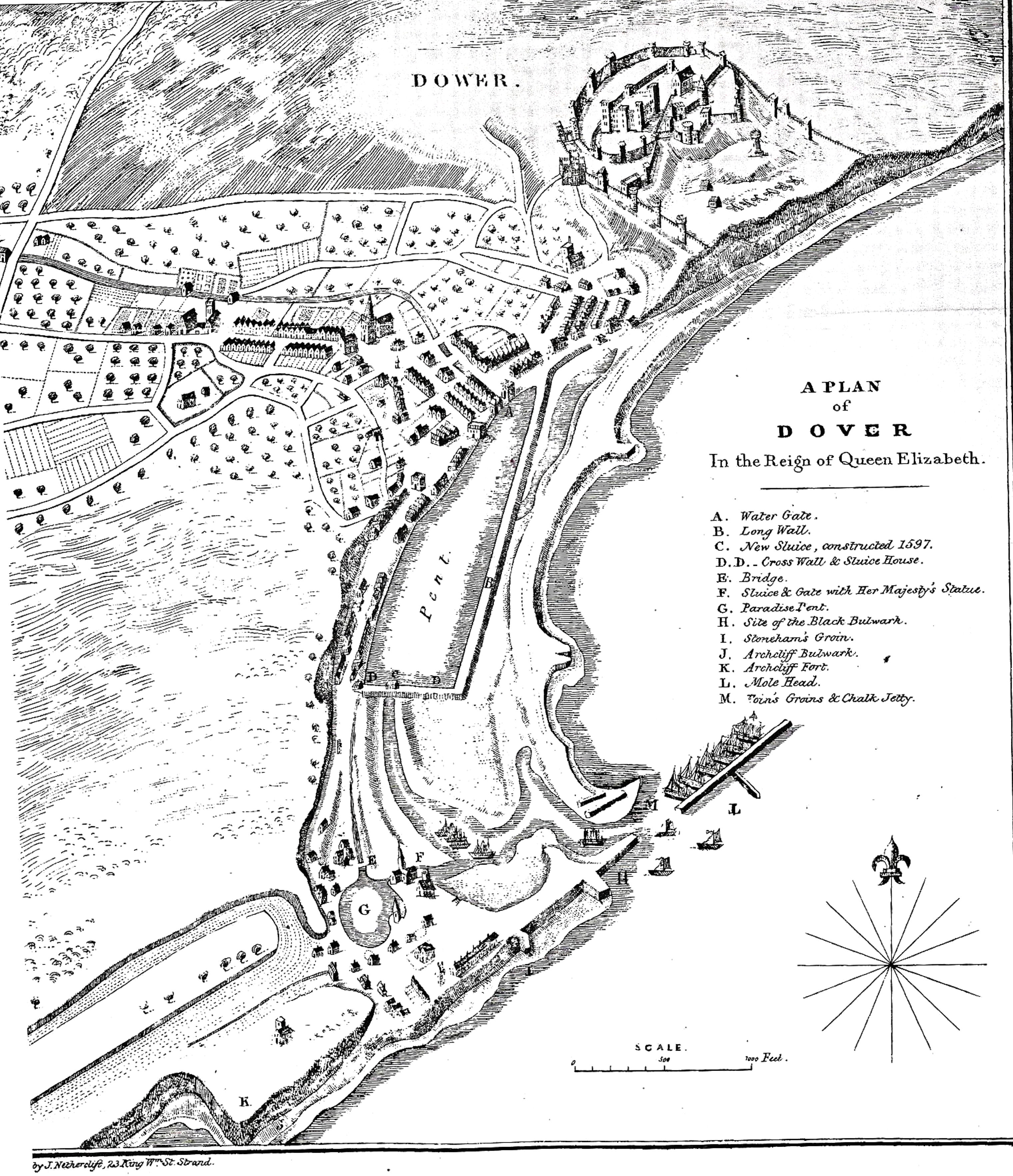 Around 1495, Sir John Clark, Master of the Maison Dieu, sought Henry VII’s (1485-1509) patronage to turn this natural cove at Archcliffe Point into a commodious harbour. This he did by building a strong bank out into the Bay with an ‘entrance through Archcliffe Point’. At the extreme end of the bank, he built two towers on which mooring rings were fixed. The mariners were so pleased with the new harbour they called it Paradise Pent. However, the effects of the Eastward Drift soon manifested itself rendering Paradise Pent useless due to the pebbles blocking the harbour gates. In 1573 Elizabeth I (1558-1603) undertook a perambulation through Kent. Dover’s Mayor, Thomas Andrews with the help of intellectual Thomas Digges (1546-1595), from Wootton – 7 miles north west of Dover – and the support of Sir Walter Raleigh (1554-1618), petitioned the Queen. Her Majesty responded by granting the town the monopoly on certain exports to provide money that enabled harbour improvements to be made.