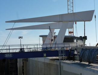 At about the same time as the bascule bridge sections had arrived so had the lock gates, two pairs. The Esplanade Navigational Channel is designed to have 2 mitre lock gates and 2 sector lock gates and it is expected that they will provide 24-hour access for marine craft. That is with the exception of extreme high tides and storm surge conditions, when the outer, sector lock gates will be shut to prevent flooding.