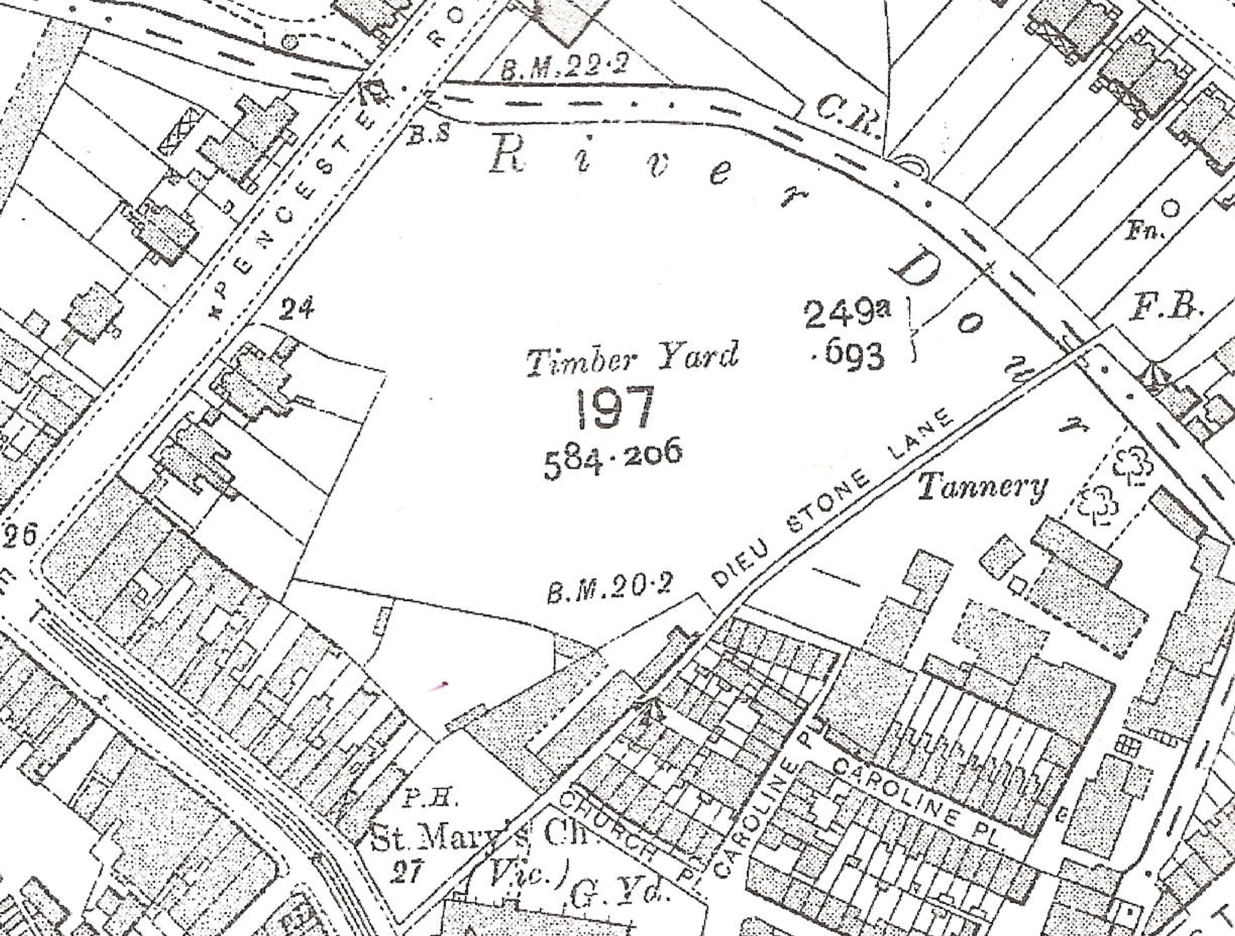 Map of 1907 showing Crundall’s Timber Yard, which eventually became Pencester Gardens and the site of the Stembrook Tannery. Dover Library