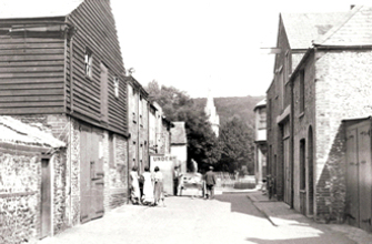 Church Place with Flashman’s cabinet factory & Union Hall on Dieu Stone Lane at the end. Dover Library