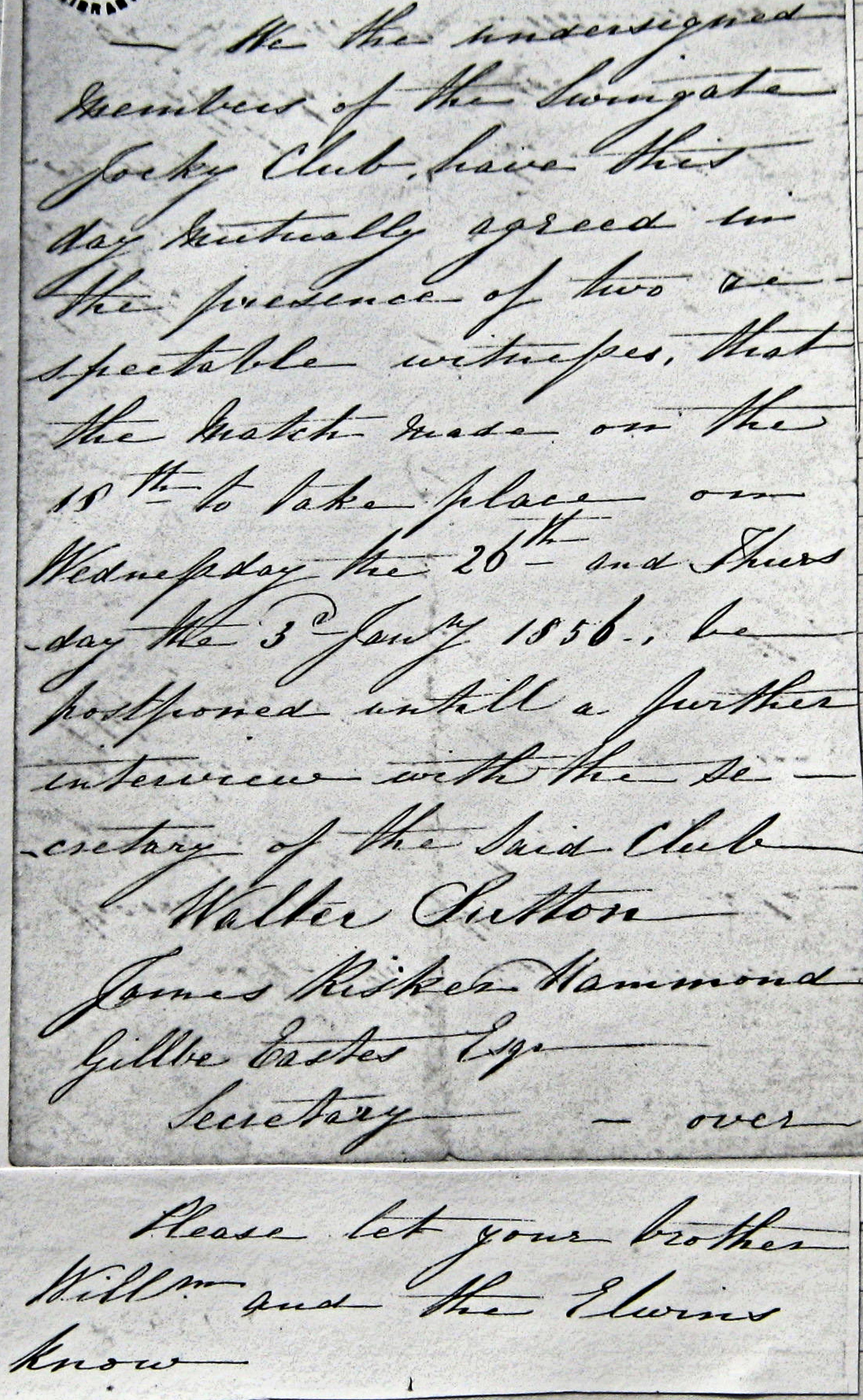 Swingate Downs had been common land for aeons but in the 18th and early 19th centuries the Dover horse races were held there. A letter from the Swingate Jockey Club circa July 1856, of which only part remains, tells of races being postponed and it is signed by Walter Sutton (1825- December 1856), James Risker Hammond (c1819 – 1879) and Gilbert Eastes (1815-1888). A postscript asks that the recipient let his brother William know and the Elwins. All those mentioned were members of South East Kent elite farming community. In the late 1850s it was believed that Napoleon III (1852-1870) was going to invade and Swingate Downs were taken over by the War Office. Mainly used as a field camp for brigades awaiting embarkation and military volunteers, a couple of huts, a cookhouse and latrines were built. When the annual Volunteer Reviews were held in Dover in the 19th century, the Field Hospital was located at Swingate Downs under the charge of a surgeon and a medical practitioner.