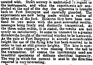 From the report in the Times newspaper of 13 October 1897, it would seem that the GPO experiment was a partial success. They wrote, ‘Both receiving stations had an aerial suspended between two masts. The accumulators (batteries) used in the experiments were charged daily at Dover Electricity Works in Park Street. The induction coil was so powerful that it produced a thick spark about 1 yard long and the messages were transmitted from a vertical wire carried up a tall pole.’ The article went on to say that ‘The experiments are now being made within a radius of three miles of the fort. Hitherto they have been confined to two miles with the most successful results, messages being freely and distinctly transmitted. At the three-mile radius, it is stated, the results are not so satisfactory. In order to make the transmission to such a distance the height of the vertical wire has to be increased, and as the pole at Fort Burgoyne is already a considerable height the use of a kite has been resorted to. The kite is composed of thin copper, with a wire running from the tail to the transmitter.’