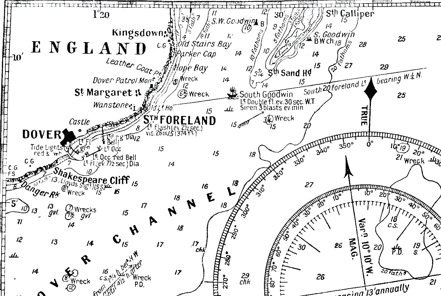 1930s Chart showing Dover, South Foreland, and the South Goodwin lightvessel close by the South Sands Head – the location of the former South Sands Head lightvessel. When Marconi was doing his experiments in 1899 the South Goodwin lightship was where the South Goodwin buoy is located on the chart
