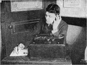 An operator receiving wireless telegraphy message using a Marconi magnetic detector. Archie Frederick Collins 1905. Wikimedia