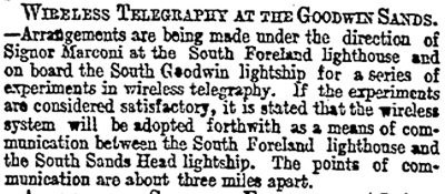 Newspaper reports of the Osborne House communications, however, supported the Duke of York’s observations. Newspaper reports of the Osborne House communications, however, supported the Duke of York’s observations. Further, in the previous February the German barque Ceres had collided with the South Sands Head lightship anchored off the Goodwin Sands. The weather that night had been clear and the sea calm but it was a new moon and so it was dark. The crew of the lightship saw the vessel approaching but was unable to attract the crews’ attention before she crashed into it. Although the barque was able to clear the catastrophe with little damage, the lightvessel’s light was smashed and her bulwarks and rigging were carried away. Totally incapacitated, she had to send up distress flares and the Dover Harbour Board tug, the Granville, came to her rescue. Although a little sceptical Trinity House decided to ask Marconi about his apparatus and if it would be possible to connect wireless communication between the South Sands Head lightship some 3 miles from the South Foreland, near Dover, with the mainland when she was back on station.