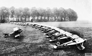 Albatros D.Vs of Jagdstaffeln (Jasta) 12 lined up at Roucourt (Douai) airfield, August-September 1917, in a similar way to those seen by the pilots of No. 54 Squadron near Arras in March. Imperial War Museum