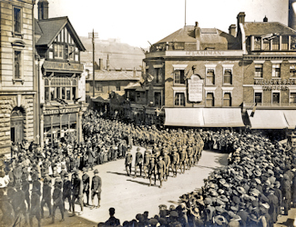 As a preparation for the invasion of Britain the Germans, on clear nights, attacked London with squadrons of Gothas. They returned to the Continent by following the London Chatham and Dover Railway line as far as Dover before crossing to Flanders. Although heavily fired upon from the ground and chased by Home Defence squadrons, they managed to drop bombs on the town and harbour. On one occasion bombs smashed the fronts of all the houses of Widred Road and made a large hole in the road damaging the water main causing a flood. Luckily there was no loss of life or serious injuries. Two heavy bombs fell together in the roadway in front of Gladstone Terrace, Priory Hill and again shattered the front of the houses and damaged water mains. Six more bombs fell on Swingate in the neighbourhood of the airsheds and another machine dropped six bombs on St Margaret’s almost on top of the bomb holes made in the sports meadow in February. Across the Channel, night after night, Calais and Boulogne were bombed and on some occasions bombs weighing more than a ton were dropped. After being damaged the François Auguste René Rodin (1840-1917) sculpture ‘Six Burghers of Calais’ was moved to the vaults of the Hôtel de Ville, Calais.