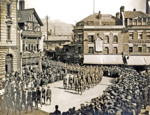 The march of the long columns of Americans through the Dover streets was vividly recalled for many years to come. During this time the South Eastern and Chatham railway line between Dover and London via Canterbury was operating 24/7. And every few minutes another troop train or a special train arrived, disgorging its occupants at Dover Marine and Dover Priory Stations then turned round to go back to London to collect more troops. Due to a landslide on 19 December 1915, the Dover-London line via Folkestone was completely blocked and remained closed for the duration of the War. Further, Folkestone harbour was, and still is, much smaller than Dover’s, for these reasons Folkestone harbour was only occasionally used for troop movement at this time, regardless of what many modern commentators say. From March to the end of June 1918, some 623,000 troops embarked from Fortress Dover for the Western Front … and the men hoped and prayed they would see the White Cliffs of Dover again.